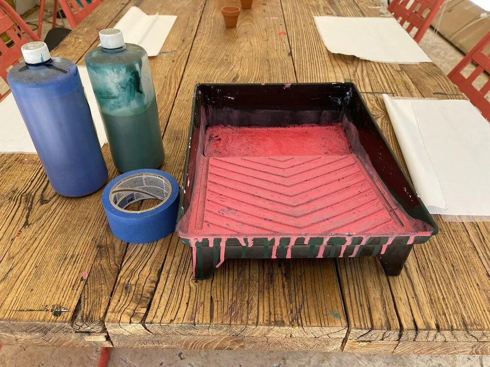 Once I’ve got all of my materials organized I pour the paint into the tray, tape my phone with painters tape above where I plan to lay and call my son.